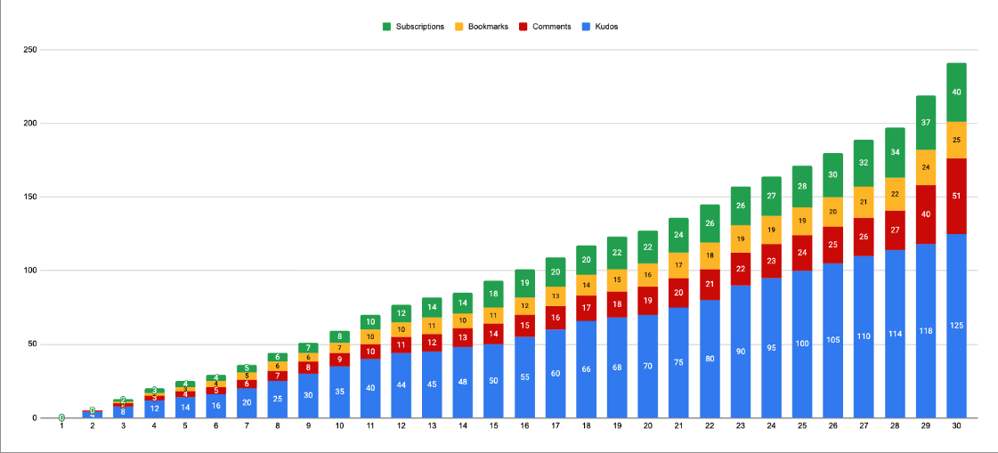 Subscriptions, either to a work or to everything an AO3 writer publishes, mean readers get emailed every time you update. That makes a subscription the single most valuable metric to a growth marketer over time.
